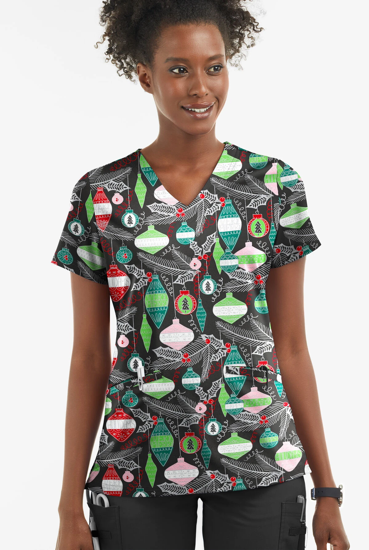 Sometimes it’s best to let the print do the talking—which is why we kept the design of this top clean and simple. It has a classic V-neck and two discreet welt pockets (angled for flattery). Bauble. What a fun word to say. And Christmas baubles on a black background are fun to look at.