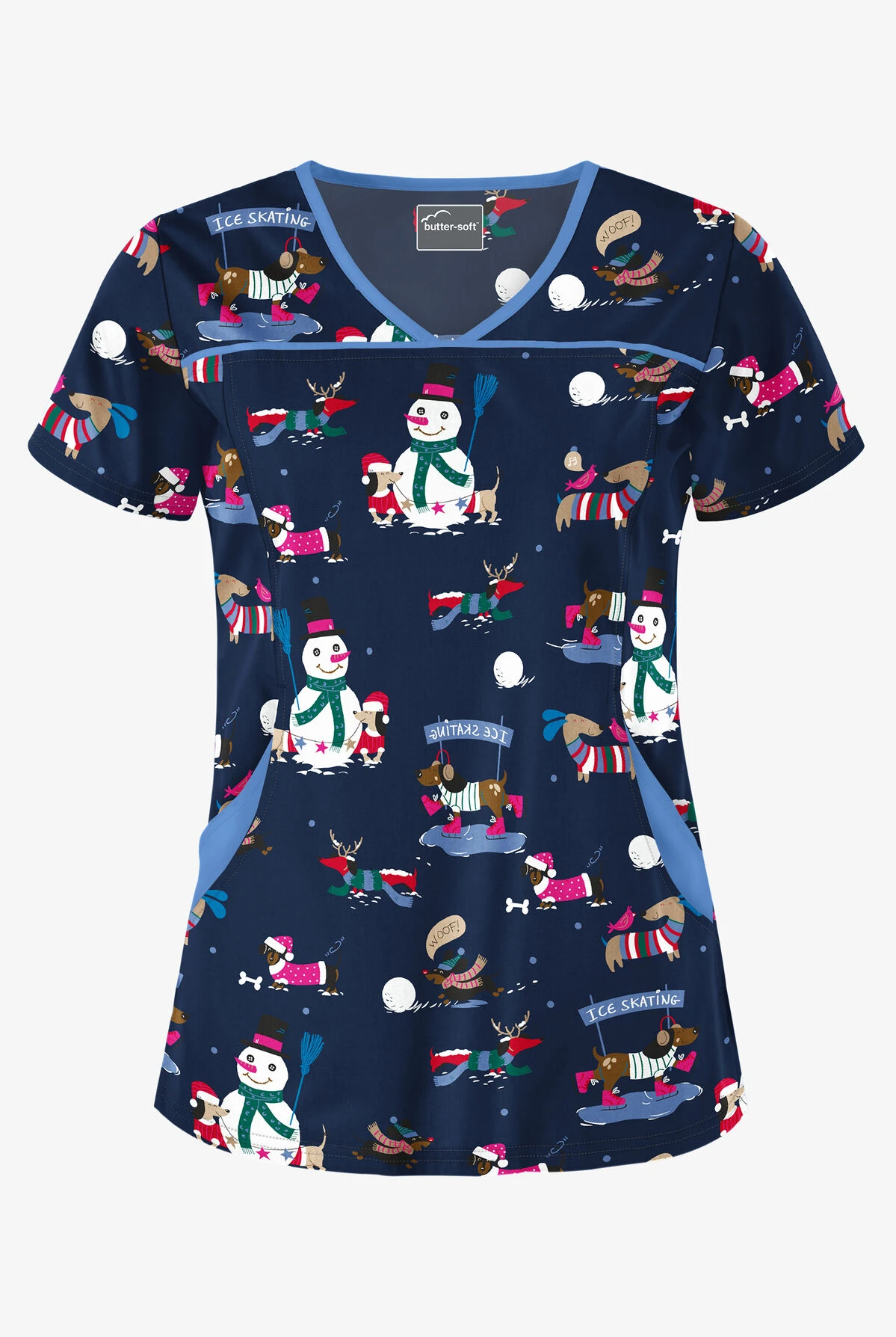 From contrast details and v-neck styling our scrub top is a standout choice for your shift. Side slits give an easy fit at the hips. Holidays and fun two things everyone could use more of. And snowmen. And smiles.