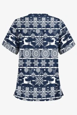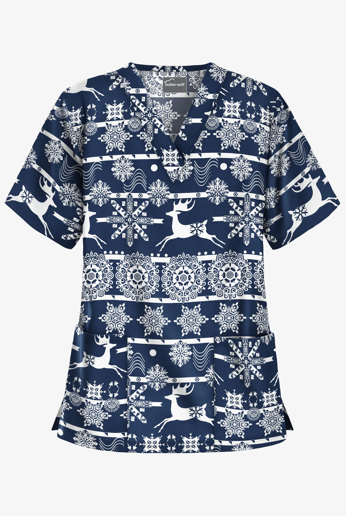 Looking for a scrub top with a little extra breathing room? Designed with a relaxed fit in a classic V-neck shape, our two-pocket top is the one. Look! A cool reindeer-and-snowflake nordic print that isn’t on an itchy sweater. Sold!