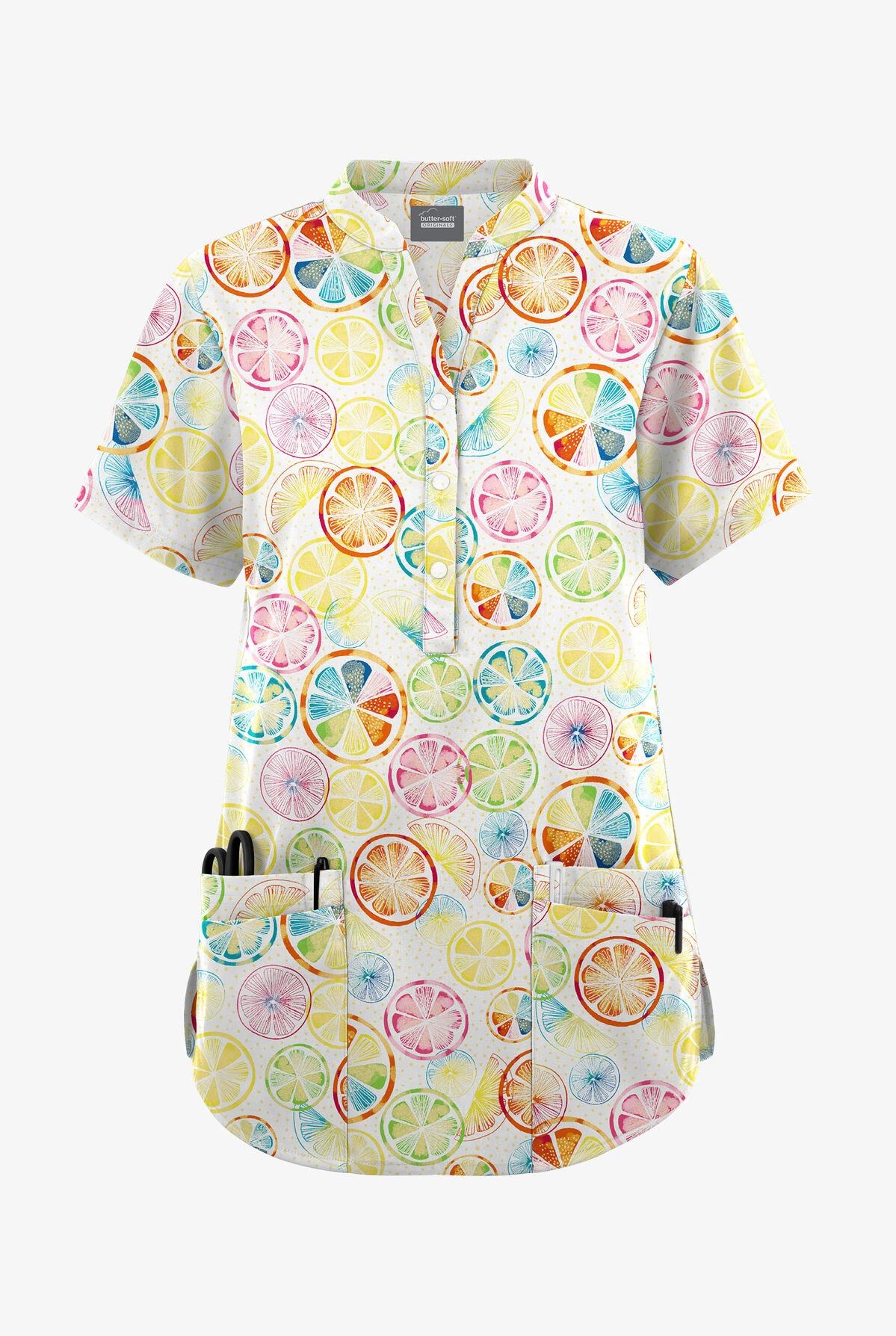 Details, details, details! Our women’s scrub top has them all. From the Mandarin collar to the 3-snap henley placket to the decorative piping—this style is truly unique.
