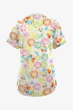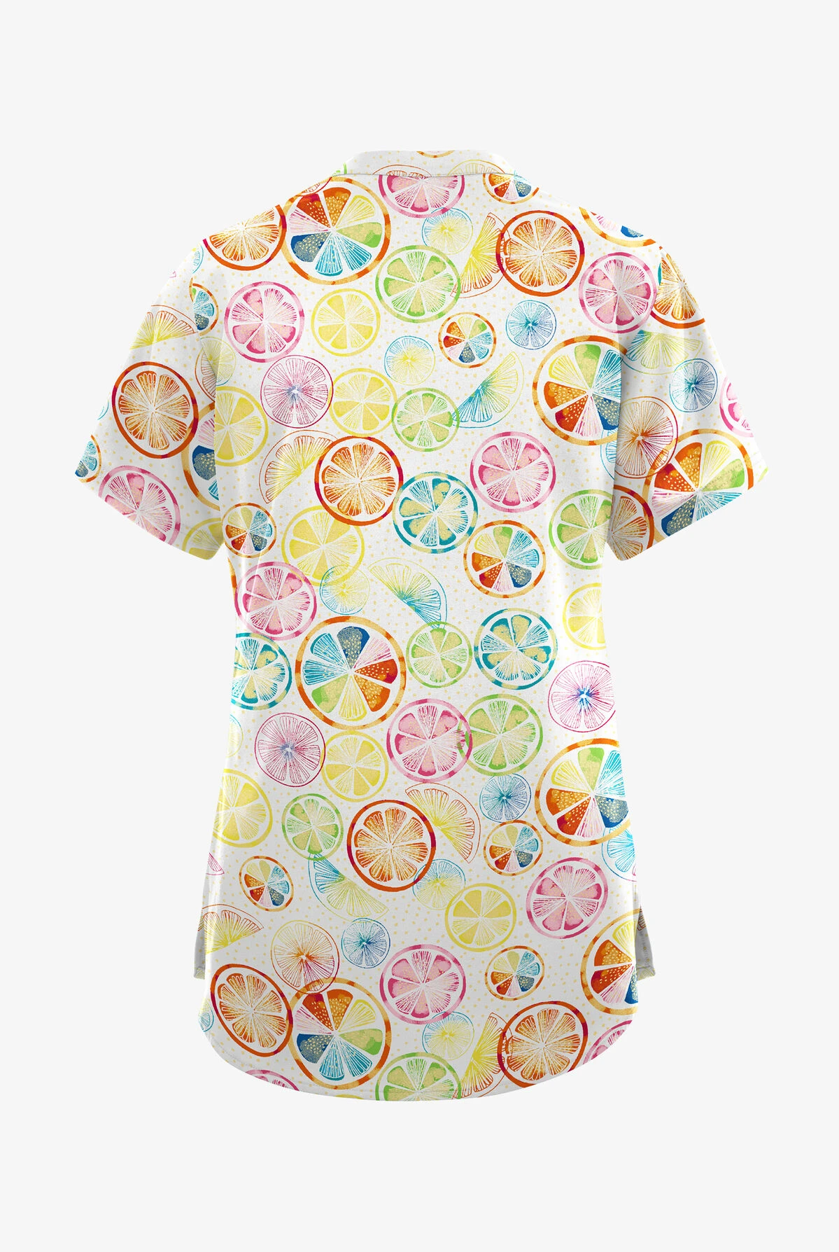 - Features multicolor citrus slices on white