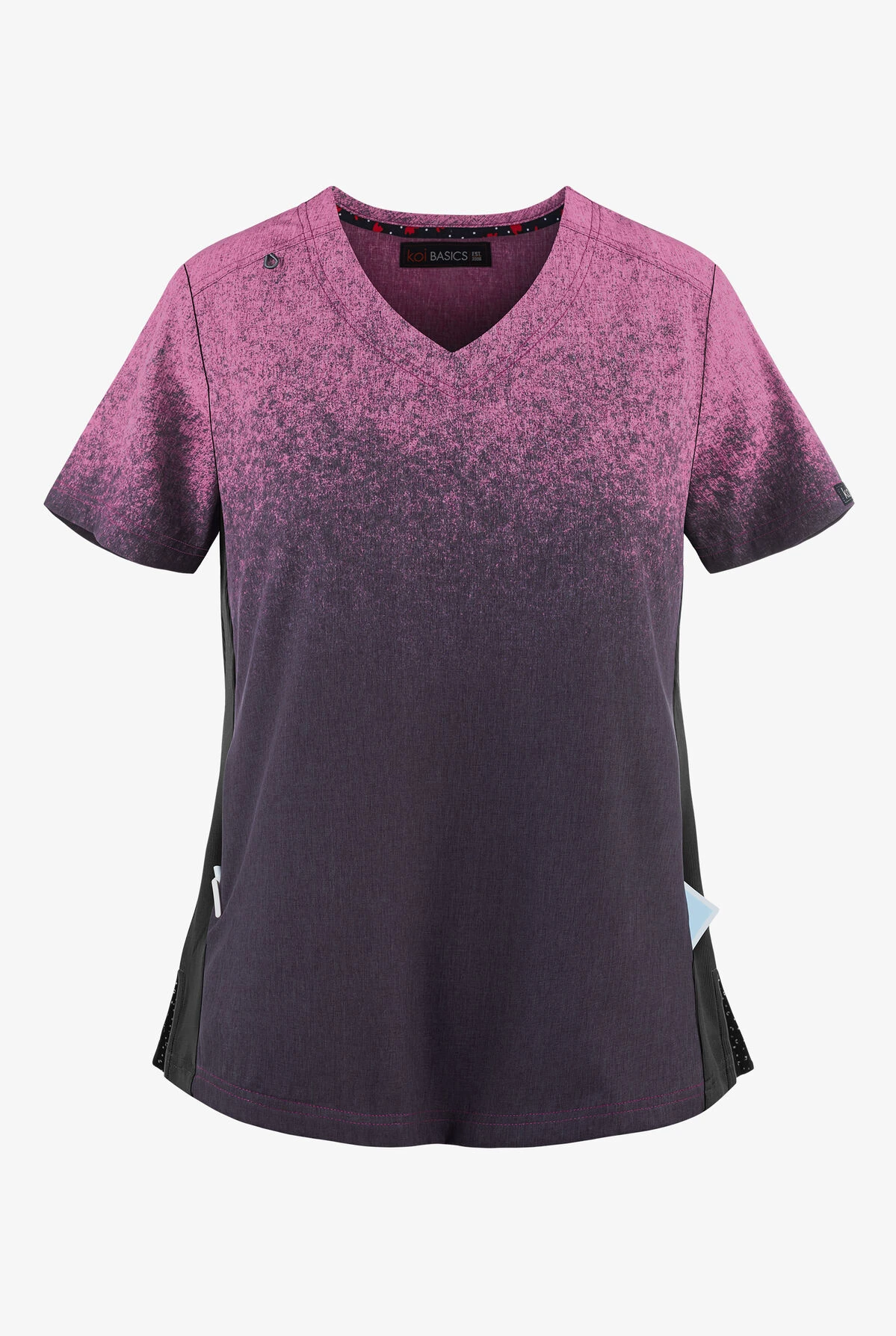The koi Basics Cali Ombre Heather Azalea Pink/ Charcoal V-Neck Scrub Top features a modern classic fit V-neck with a fashion-forward Ombre print. Top has front shoulder yokes with bungee id loop on right side and contrast double needle stitching on V-Neck, yoke, sleeves and hem, side slits with foulard trim inside, foulard trim inside the back of neck, rib knit side panels for shaping, and two inseam side entry pockets. Fabric content is breathable, light weight, moisture-wicking 90/10 poly/spandex and 95/5 poly/spandex panels.