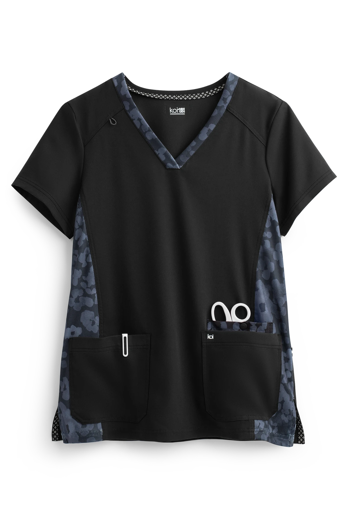 The koi Next Gen 1051-2 Better Than Ever Black V-Neck Print Scrub Top features a printed rib knit trimmed crossover V-neck, front shoulder yokes with a bungee ID loop on right, printed rib knit side front panels, side vents with foulard trim, back darts, black and white striped locker loop, and 3 pockets 2 front patch pockets with a printed snap closure slip pocket inside left. Fabric content is 73/22/5 poly/rayon/spandex, rib knit is 95/5 poly/spandex.