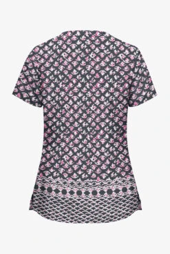Add individuality to your scrub style with this scallop neck scrub top! Back darts give this fashion print scrub top a feminine shape for a flattering fit. There are two side seam pockets to store everything you need. Side slits provide a better fit. The print fabric is 55/45 Cotton/Poly.