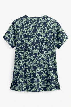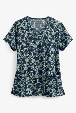 The UA Butter-soft Stretch floral vines navy criss cross print scrub top features a tailored fit through the chest, back darts, and a sophisticated criss cross trim detail on the bottom of the rounded v-neckline. For all your storage needs, there are 4 front pockets, and the side slits make this top flexible for all day wear. Made of 97/3 poly/spandex. The approximate length for size m is 27.5″.