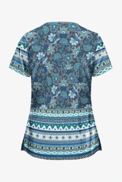 Sometimes it’s best to let the print do the talking—which is why we kept the design of this top clean and simple. It has a classic v-neck and two discreet welt pockets (angled for flattery). So many pretty elements – flowers and ornate stripes – in this gray-and-turquoise border print.