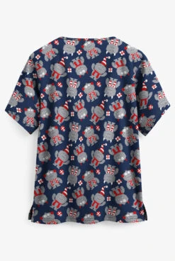 Loose fitting and comfortable, the UA Holiday Monsters Navy V-Neck Print Scrub Top will help you move with ease during your toughest job this holiday season. This print scrub top has a V-neck, two large pockets, and side slits at the hem. Made of 55/45 cotton/poly blend.