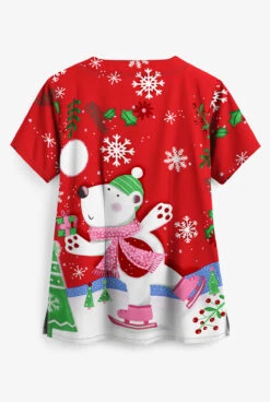 The UA Polar Bear Fun Red Scallop Neck Print Scrub Top features a comfortable scallop neck, two side pockets for optimum storage, fitted back darts, and side vents. Made of 55/45 cotton/poly.
